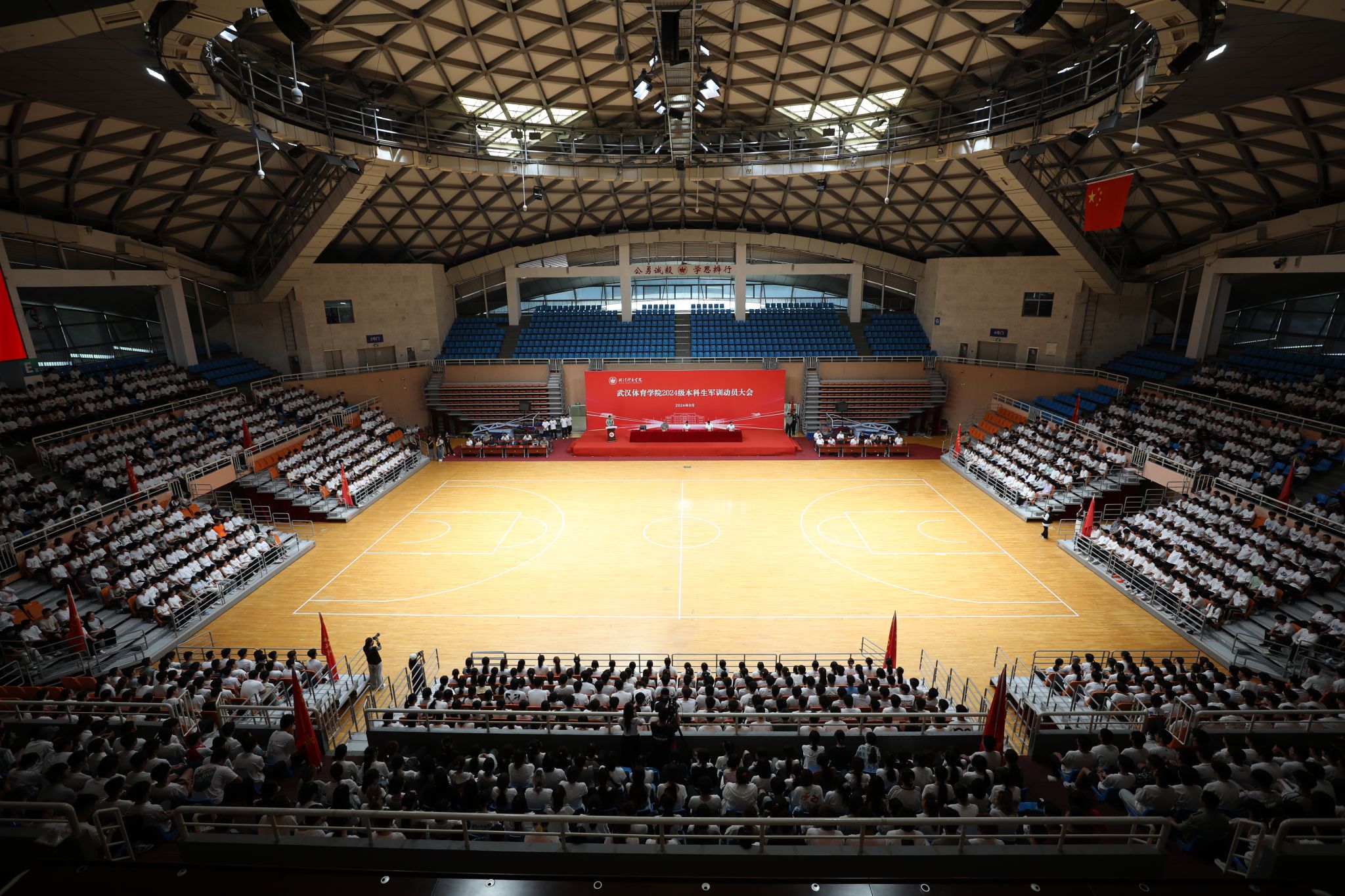 新闻网讯(通讯员李鑫)奋斗逐梦,高飞远航。热血青春,军训开启。9月18日上午,武汉体育学院2024级本科生军训动员大会在学校体育馆举行。党委副书记、副院长张飙,党委常委、副院长潘高峰,承训部队、相关职能部门和各学院负责人,全体承训教官,2024级本科辅导员及全体学生参加大会。