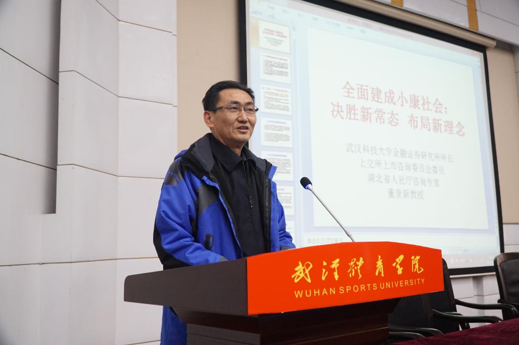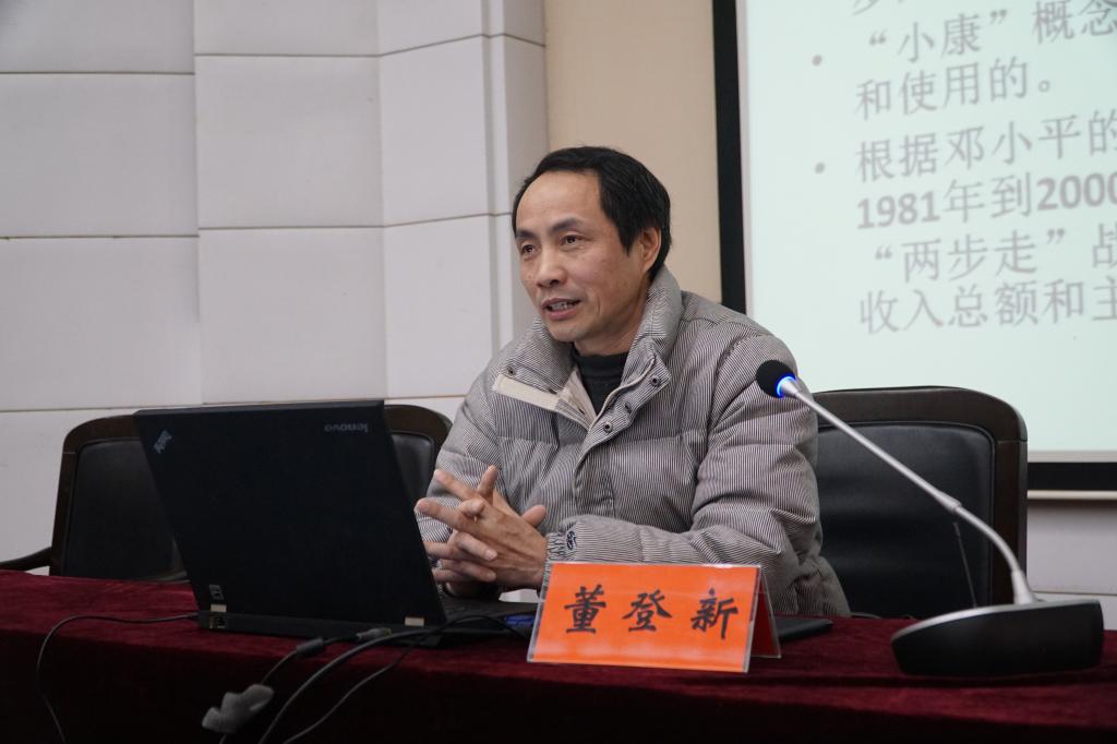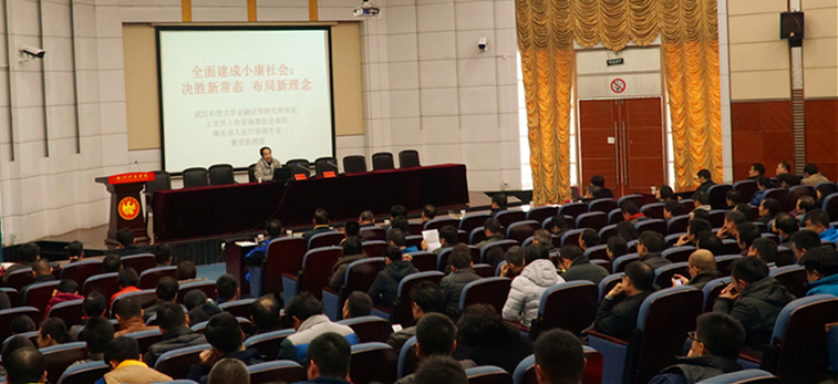 省委宣讲团成员、武汉科技大学金融证卷研究所所长董登新教授应邀来我校作了题为《全面建成小康社会:决胜新常态 布局新理念》的专题报告。董登新教授全面系统地解读了十三五规划的历史意义;十二五时期取得的成就及十三五面临的挑战和机遇;十三五规划的主要目标、基本原则和发展理念。报告用时两个半小时,董教授报告紧扣十三五规划建议的总体架构和基本精神,采用习近平总书记系列重要讲话和大量数据解读十三五规划建议的重大理论创新及具体内容,既有理论高度,又有实践深度,进一步加深了与会人员对十八届五中全会精神的领悟。