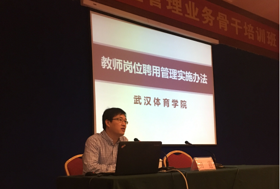 11月9日下午,我校人事处副处长田霆代表人事处发言。近三个小时的交流中他从武汉体育学院基本情况、文件的出台背景、文件的目的、文件的理念、文件的技术路线和文件的结构等六个方面全面介绍了《武汉体育学院教师岗位聘用管理实施办法(试行)》,详细对我校教师岗位聘用管理的岗位类型设置,岗位聘期职责和聘期考核办法进行了介绍说明。