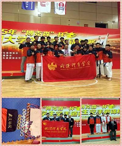 由中国大学生体育协会空手道分会主办、广东体育职业技术学院承办的2015年全国大学生空手道锦标赛11月9日至13日在广州举行,本次比赛来自全国36所高校,379名学生参赛,我校以运动训练学院学生和研究生院学生组队参赛,在专项老师庞俊鹏的带领下,经过5天激烈角逐,我校最终获得4金5银7铜的好成绩,位居高校金牌榜排名第二名,成绩如下: