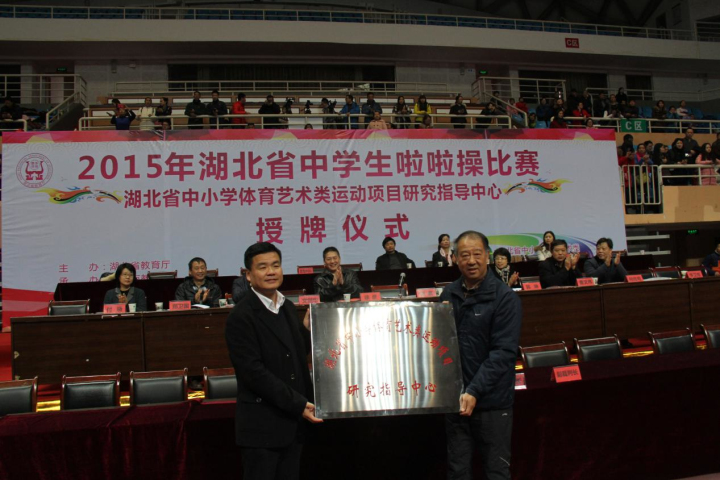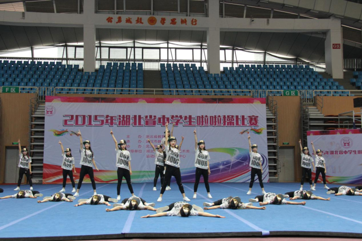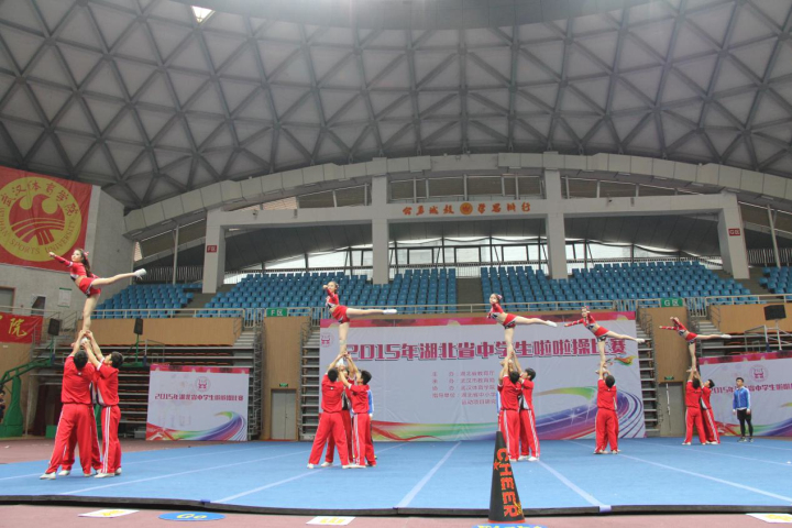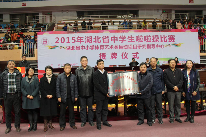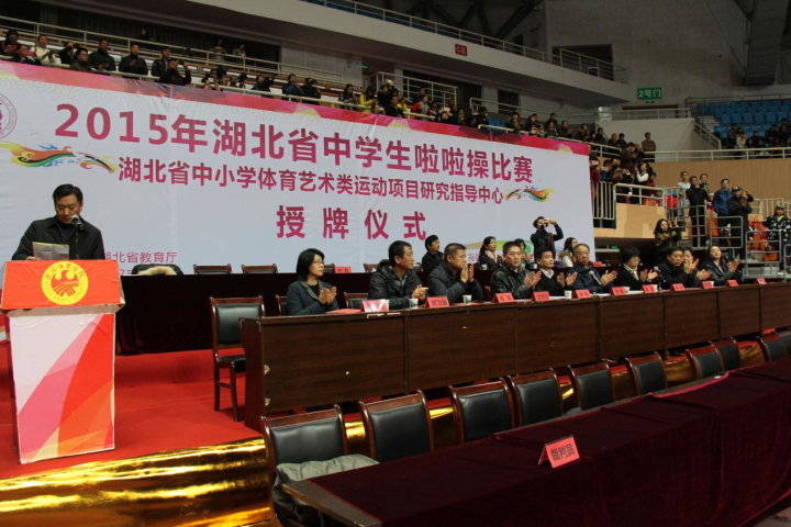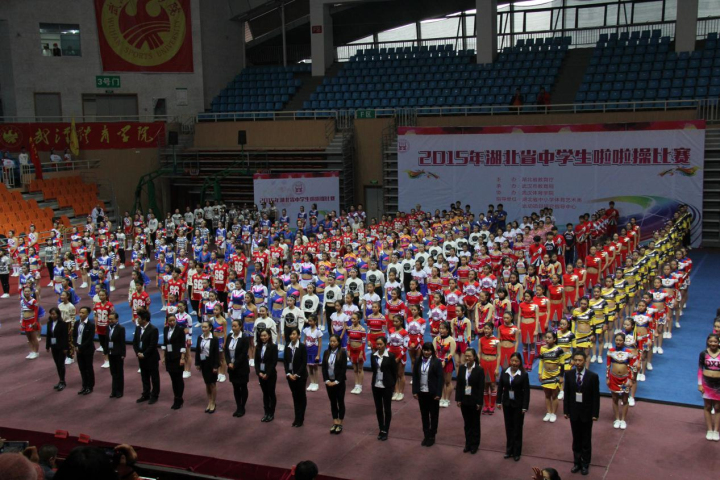 12月6日,由湖北省教育厅、湖北省体育局主办,武汉市教育局、武汉市体育局承办,武汉体育学院协办的2015年湖北省中小学生啦啦操比赛在我校体育馆举行开幕式,出席开幕式的领导有武汉体育学院副院长张飙、省教育厅体卫艺处处长杨跃、湖北省体育局青少年体育处处长徐彦、武汉市教育局副局长郭琳、武汉市教育局体卫艺处处长曹文伟、武汉体育学院竞赛与场馆中心主任程序、武汉体育学院艺术学院书记柯俭苟、全国啦啦操委员会副秘书长武汉体院学院教授李卫东。由湖北省教育厅体卫艺处处长杨跃致开幕词,预祝比赛圆满成功。