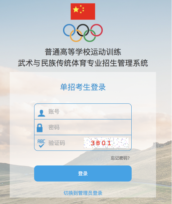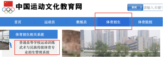 第一步,在首页点击“体育招生”栏目,选择普通高等学校运动训练武术与民族传统体育专业招生管理系统