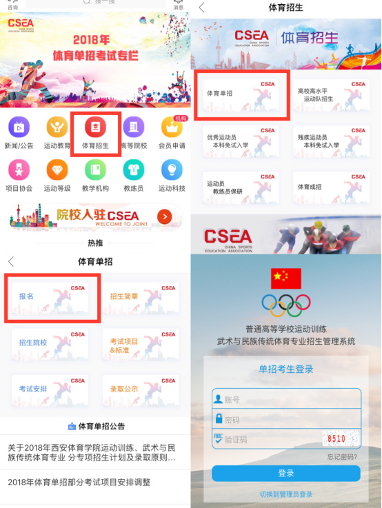 方式二:“体教联盟”APP,依次点击“体育招生”,“体育单招”,“报名”即可进入报名系统